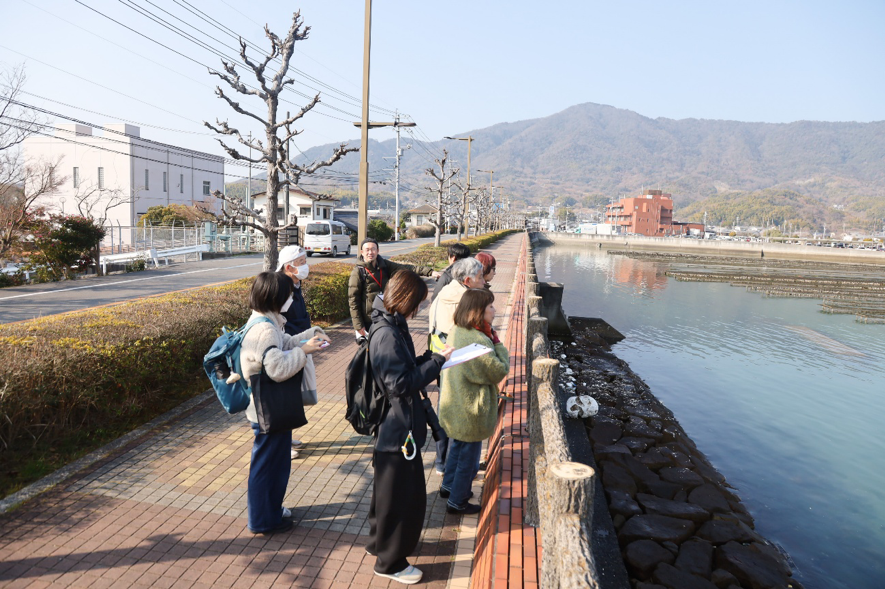 中町桟橋に集合し、まずは海沿いをウォーキング。江田島を代表する産業である牡蠣の養殖について、実際の牡蠣棚を見ながら学びました。 干潮と満潮の差が4mもあり、波が穏やかな江田島の海は、豊富な水揚げ量を誇ります。あえて厳しい環境に置く「抑制棚」で強い牡蠣だけを残すというこだわりの育成方法を伺った一方で、近年は環境の変化によって牡蠣が獲れにくい環境に変わりつつあるという、リアルな海の課題にも触れる時間となりました。