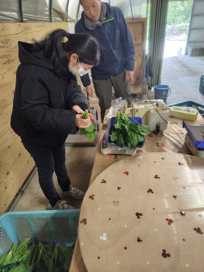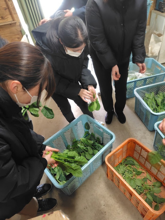 収穫したほうれん草を袋詰めするため