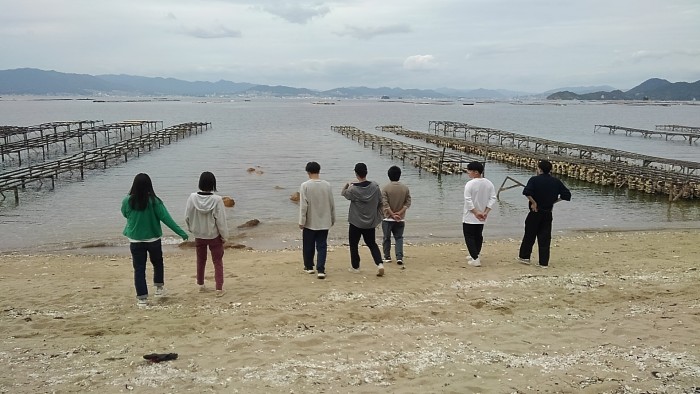 海岸に漂着する養殖筏の残骸の竹を集め、炭化させ、これを休耕地や田畑、山林に散布して土壌改良、有機物を増加させ、里山から海に流入する栄養塩を増やせないかと考えた取り組みを、修道大学の学生たちと取り組んでいます。
