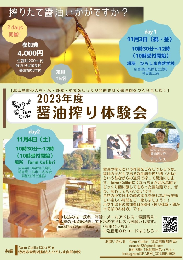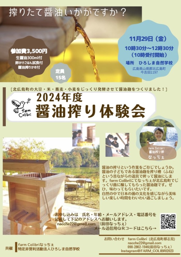 自然の中でゆっくり醤油を搾りながら、搾りたて醤油をみんなで味わいましょう!!平飼い卵かけご飯も用意してお待ちしてます!